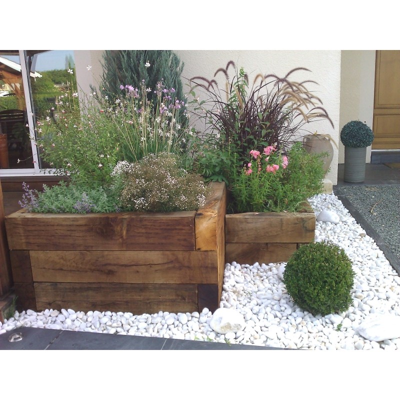 Traverse Paysagère en Chêne de France, naturelle OU traitée autoclave classe 4 Vert ou Marron, qualité bocagère ou élégance. Dimension : 100 x 200 mm en 2.40 m - 120 x 200 mm en 2.60 m. Finition : brut (3/4 arrêtes vives coupées d'équerre).
